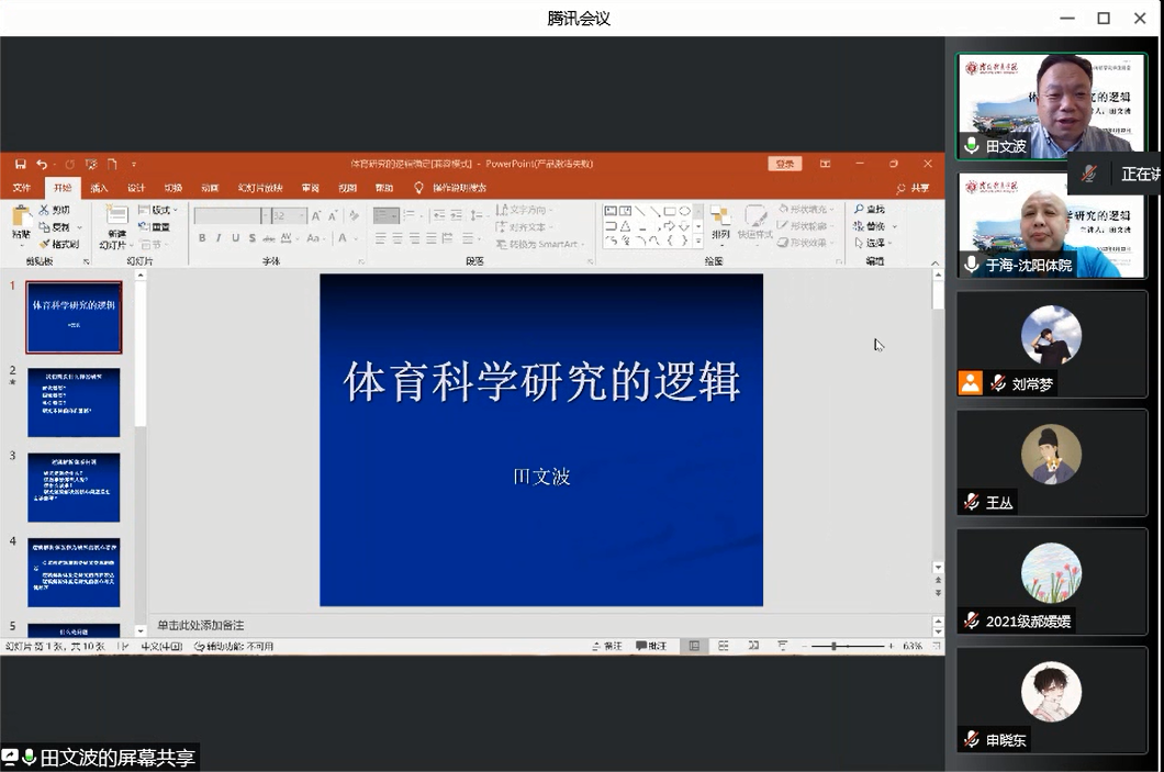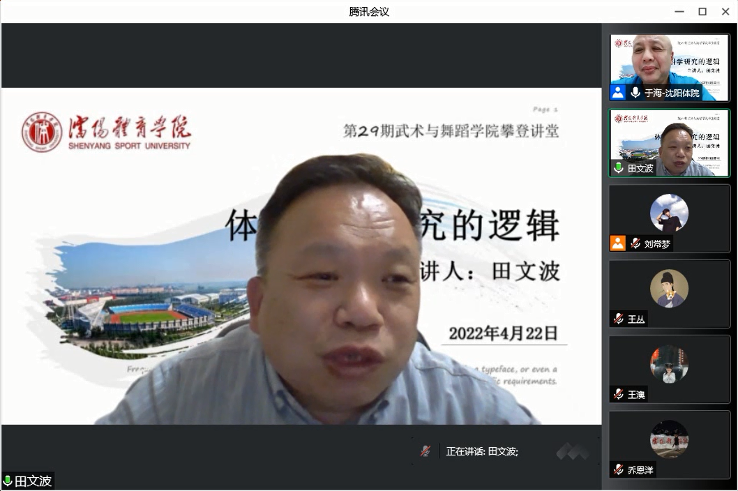 4月22日,yh1122银河国际举办第29期攀登讲坛系列学术讲座,邀请河南大学武术学院田文波副教授通过腾讯会议为全体教师和研究生线上进行了题为“体育科学研究的逻辑”讲座,讲座由副院长于海主持。